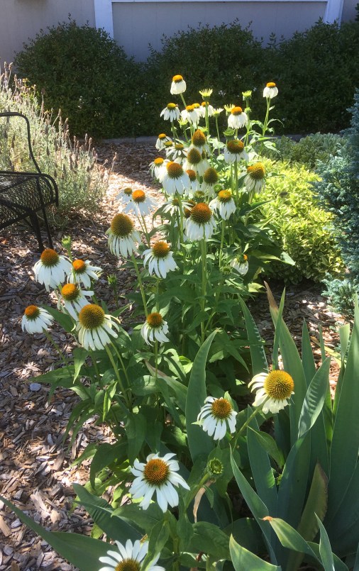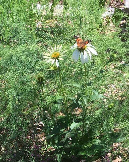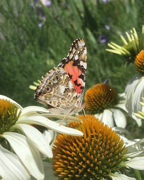 The white echinacea were covered in blooms when I got home from my three weeks away. These flowers make striking backdrops for butterflies especially, and a Painted Lady was giving me lots of photographic opportunities yesterday. I’m sharing several pictures because each one highlights a different aspect of the exquisite form; the light changed slightly, the insect opened its wings wider…