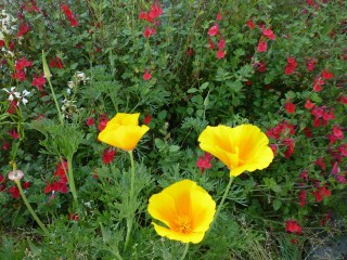 At the corner of my cracked driveway, there my own dear flowers greeted me: the Mexican Evening Primroses, and the California poppies that have only recently added themselves to that display. So I snapped one more picture to detach from the whole landscape and atmosphere to put here flat on the screen. I’m glad you all have enough right brain function to appreciate them such as they are; along with them, I send you my love.