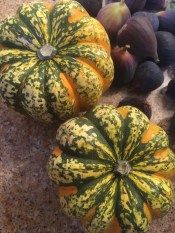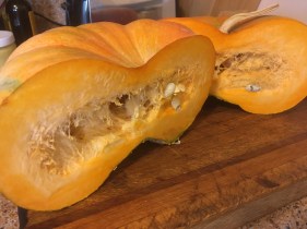 The one above is what I bought this year at Trader Joe’s, and it was merely called “Heirloom.” I think it is a Rouge Vif D’Etampes. Last year I found one at a farm stand, and was impressed by its sweet, deep orange flesh.