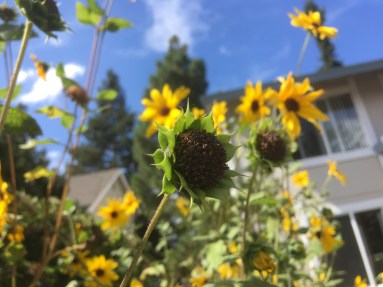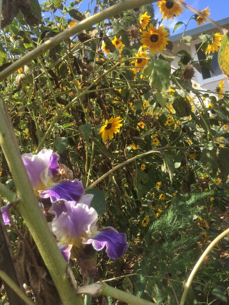 Birds are very busy in the runaway tangles of berries, vines and ripening seeds, such as in the patch of sunflowers in my front yard. I wish I knew who the little ones are that flit about there every day and fly away as soon as I get near.