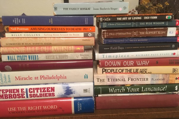 Busy as my days have been, full as my house already is with books, when I returned a book to the drop slot at the library I succumbed to the temptation to look into the five ! 4-foot cube containers of books out in front, evidently what was left over from a book sale, books that were intended for thrift stores but — the truck had broken down, or what? We who were rummaging through only knew that the library staff had told us to take what we wanted, and yes, for free.