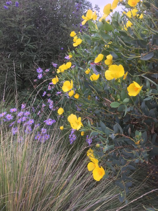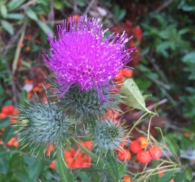 And flowers! Maybe because the edges of the walking paths were sheared in September, a few Queen Anne’s Lace flowers have opened near the ground. This thistle caught my eye, the first I had seen all year, contrasting in color and development with pyracantha already in the berry stage. Above it, the shrub with yellow flowers is one I don’t know, but it looks like it may originate in the southern hemisphere… I say that only because the leaves remind me of bottlebrush. Does anyone know it?
