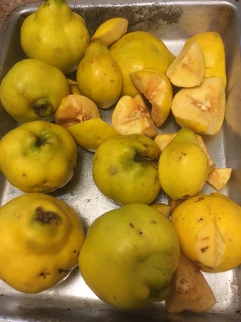 In the past I have mostly baked them, and that was much easier. I love quince and am sad that so few people have trees anymore. I have put out queries some years to search out whether anyone knows of unwanted quinces I could take; this batch came to me completely out of the blue, unasked for.