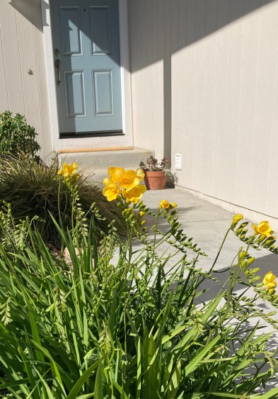 Because we haven’t had any rain in several weeks — or has it turned into months? — I had to put the hose on potted plants that aren’t on the automatic drip system. Hidden behind one big pot, this little great-grandbaby of a cactus I started was in full baby bloom. I brought her indoors to brighten up my kitchen, still lit also by the fairy lights, which are there for the days when spring is clearly not. yet.
