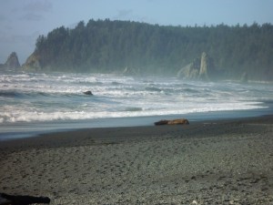 Olympic National Park is kind of like a wheel with spokes going in, but no hub; we had to drive long distances from the outer rim of the park into the choice areas. On the way along the rim to our first spoke, we spent time on Ruby Beach, where the surf crashed and the air was bracing. Just now I was wondering how it compares with the eastern coast in latitude, and after a bit of hunting and pecking around the Net I can tell you that it’s similar to Prince Edward Island, and still well south of the British Isles.
