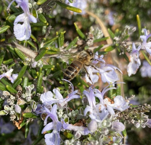 But what is THIS? A ladybug, yes, I know, but the bug is sitting on a stem of rosemary! A stem of a bush that is taking over a pittosporum bush, and already blooming, and I never saw it until today. It’s from a root left over from the gnarly plant that was there until three years ago; what a surprise that it didn’t show itself all this time, until now.