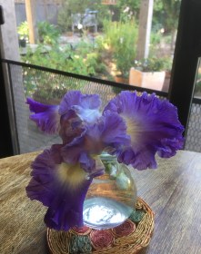 the night breezes are too chill. The sunflowers continue in their enthusiastic blooming behavior, and the repeating irises never stop! I accidentally broke one off today so it is in the house.