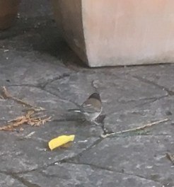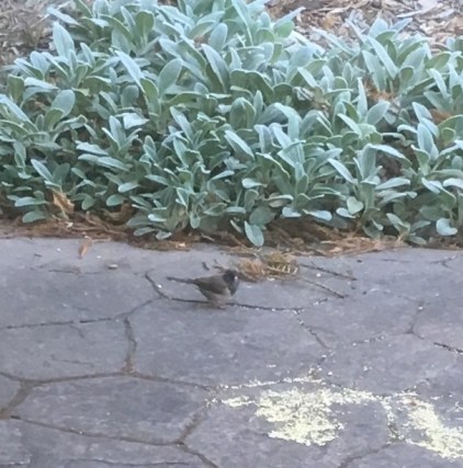 he didn’t pose – he and his friend only hopped about on the patio and this is as close as I could get to them, through the window in my kitchen and family room. Yesterday I gave up getting a picture at that distance, and began to look for pictures online, but they were not my juncos; this morning I managed to get (fuzzy) images that are much as I usually see them, with their signature little black caps being the most distinctive feature for sure. My husband first told me who they were, long ago, and it’s always exciting when they arrive in the garden and hang around the neighborhood for months.