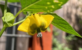 This is the first year I’ve ever grown a tomatillo. My neighbor gave me a seedling that he had started. It is branching out everywhere with yard-long stems, and the husks that will house the fruit, as yet unformed, are tender lime-green lanterns. In this next picture it’s climbing over a tomato vine so there is a confusion of types of leaves.