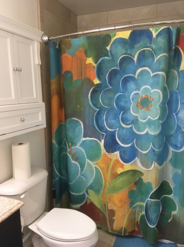 The new bathroom is pleasantly boring in beiges and white, tile and granite. I wanted it that way so I could have colorful towels and shower curtain. That storage cabinet at left I found at Home Depot and bought another one for the master bath.