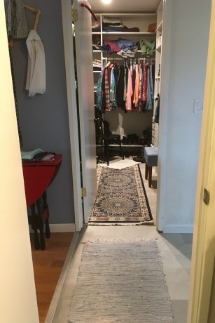 My closet got refurbished, and I added a little dressing table to replace what got lost when the two rooms were linked by a door in that spot. It was so long between the time I made decisions and the completion of those shelves, I don’t remember how I ended up with melamine, which is really cheap. So I bought a piece of plastic to put on the dressing table top, to protect it from getting wrecked. The next picture shows the view from the bathroom.