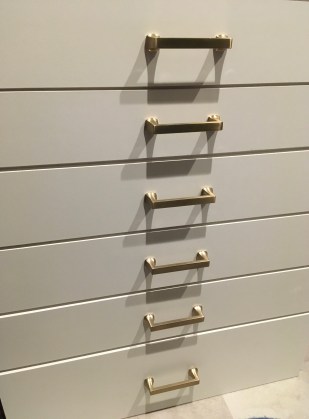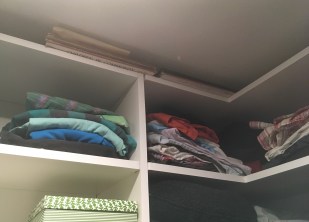 This is the one bank of drawers I have in the closet. Because it has nice drawer pulls it looks upscale and makes the closet feel fancy — until I want to open the bottom drawer, which as you can see sits right on the floor. So that doesn’t work very well. The shelving units didn’t fit nicely in the crooked old closet space and there are shims and gaps everywhere. Like a 1-2″ space at the ceiling, big enough to collect dust and spiders, but too small to store anything — except for our entire vinyl collection! Maybe I will find some other belongings that are conveniently short and flat, that need storing.