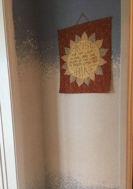 At right is an unfinished area of my bedroom, which had to get repaired after pulling out an old built-in cabinet. There was a nail still sticking out so I put up this hanging I found in a box, that I made eons ago. I still have a lot of painting to do (I should say, for someone to do) in my room, and a few other rooms of the house.