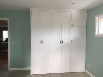 Above, you can see through the doorway at left into my bedroom. My goddaughter Mary’s father A. made the cabinet doors for me and trimmed out everything. It was so heartening to have someone who was enthusiastic about doing the work and even communicated with me about it! Not to mention the beauty of the result. He had no part in the work that I complain about farther down.