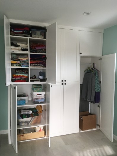 I’m sure I’ll be rearranging sewing things again and again, but for now, I have all my fabric and projects in the cabinets in the proper room. I did remove five boxes full of fabric from my stash, which I will give away, but I kept all of my Waldorf doll supplies. And all of the luscious fabric I brought home from India.