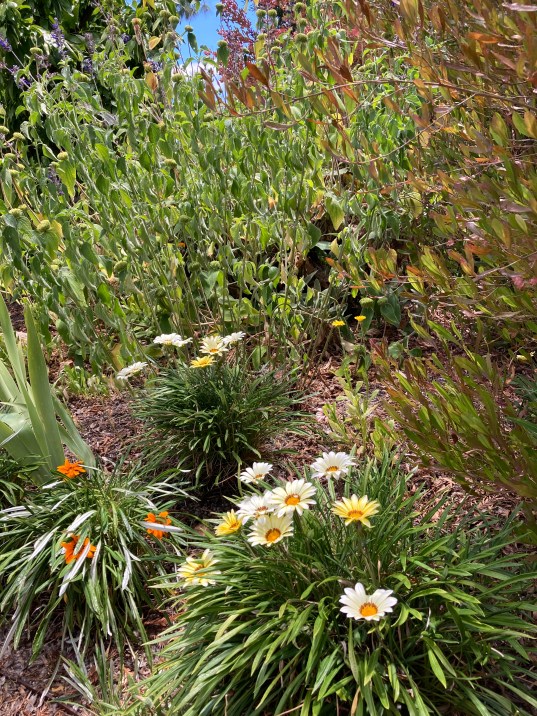 After lunch, I found myself in the garden where the gazanias have been needing deadheading for months; suddenly I decided to settle down and just do it. These plants have been proliferating since I freed them from being crammed in a pot. It’s hard to believe all of them had been in that one pot… well, maybe it was two or three pots. But they do multiply! They are constantly making “drop-ins,” as my long-ago neighbor called the self-sown volunteers.