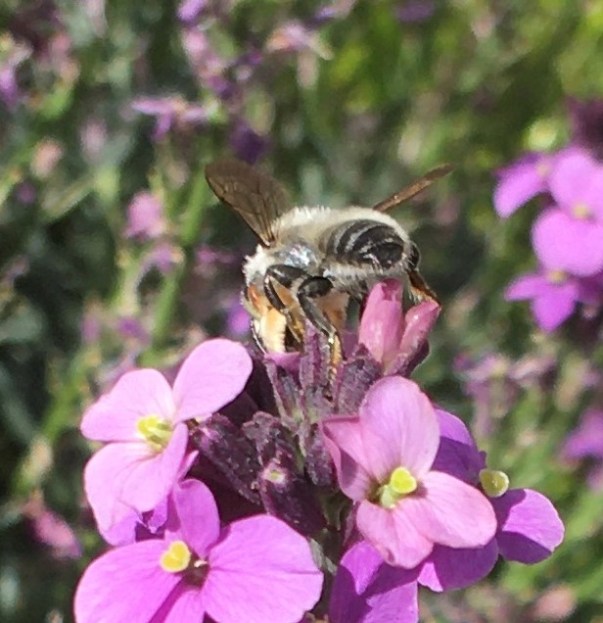 Carpenter bees were working at the white salvia that has filled out so well and become a definite feature of the landscape. Only carpenter bees were there. What about the other flowers? On the wallflower, grown to a prominent bulwark of purple in that area that is squeezed between the street and the driveway, buzzed a half dozen different sorts of pollinators, among them honeybees (I hope), stripey little bumblebees, and a species new to me, with bright yellow abdomens underneath.