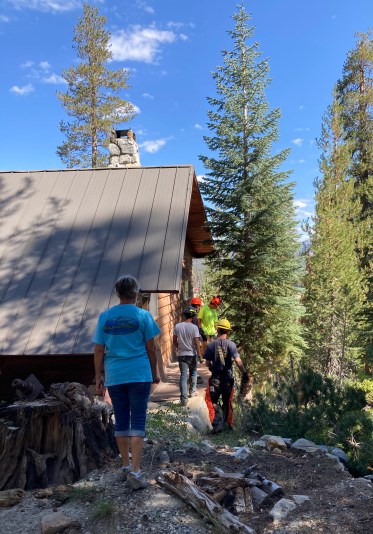 One cabin up the road is the sort of work center for the crews, and every night whoever wants can join them to eat and sit around a campfire. While I was there for a few hours last night we were often chatting about the wildfires that even now are blazing in the foothills below here, where several cabin owners have their first homes. Cell phones were often used to check for updates, especially regarding the brother of one of our company, who sent a photo of the dark smoke billowing just behind his house.