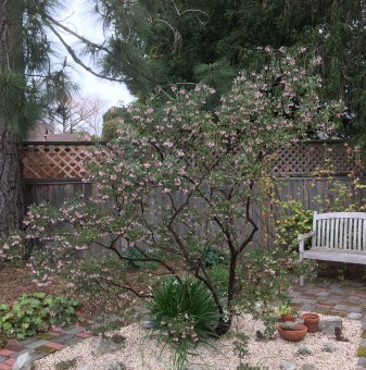 My particular manzanita tree is not bushy, and only briefly ever was, in its youth. It’s always difficult to get a picture of the whole plant; because of its airy form, whatever is growing behind it shows through and you can’t see how beautiful the tree itself is. As I did yesterday, I typically just show parts of it here on my blog. Here is one view from the past: