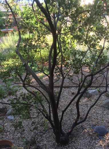 Back in the 80’s when I lived in another town, my horticulturist neighbor took the lawn out of her front yard and planted sixteen manzanita bushes there next to the driveway. I was mightily impressed. The last time I drove by, they were still looking beautiful, at least to my eye, which is accustomed to those twisty, even artsy lines. I know that some of you will remember when I went to a lot of trouble to get a branch of manzanita installed in a corner of my living room.