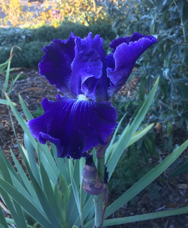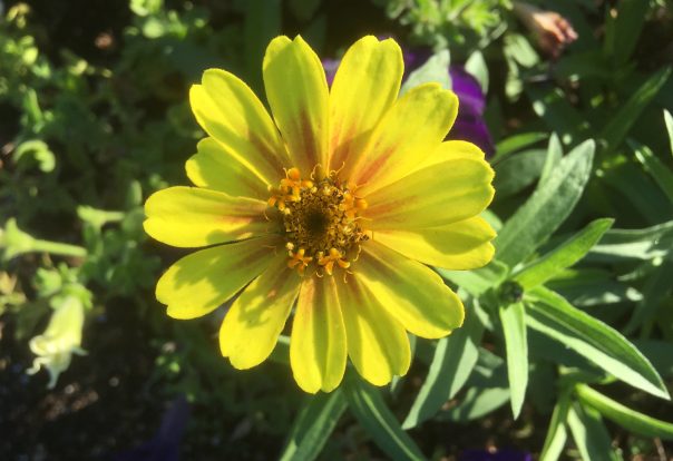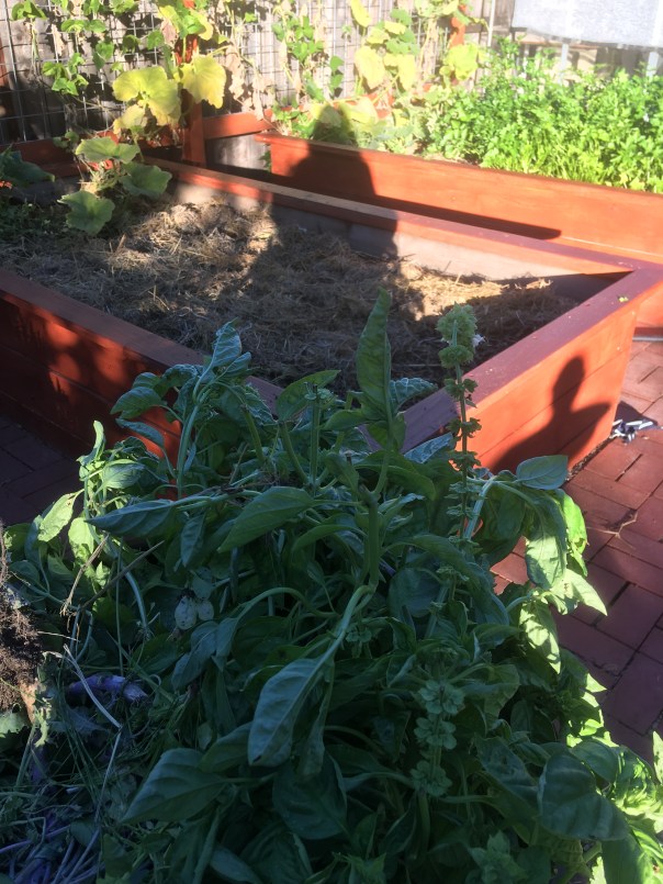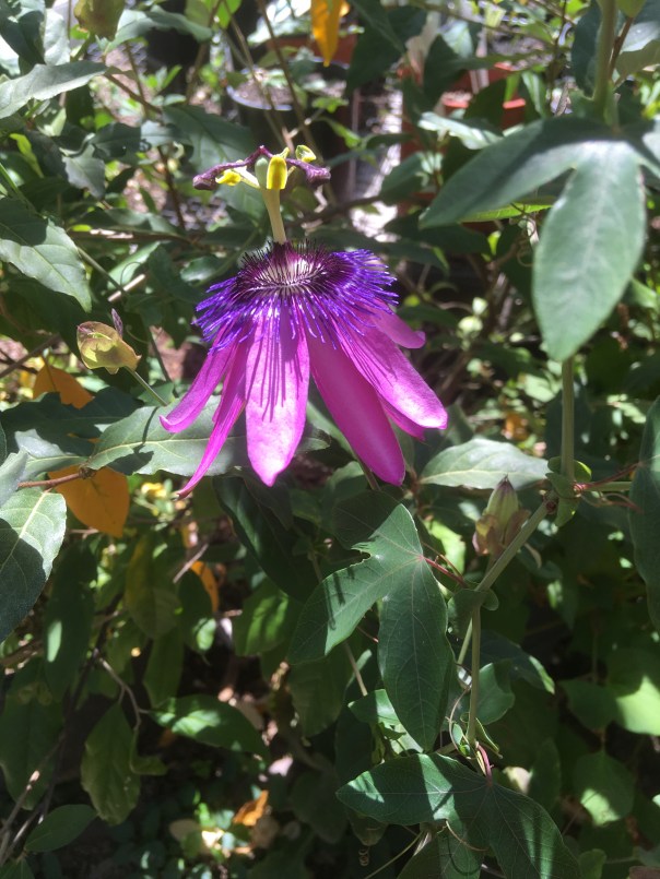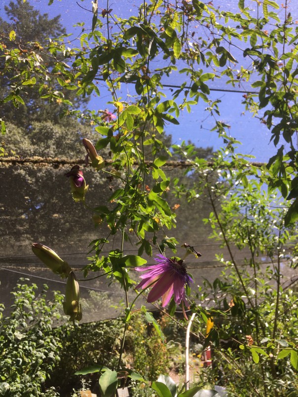 When the zucchini was gone this flower was revealed, its bloom pristine though its leaves are sooty. My Seek app can’t identify it, and I don’t recall seeing such a plant here before.