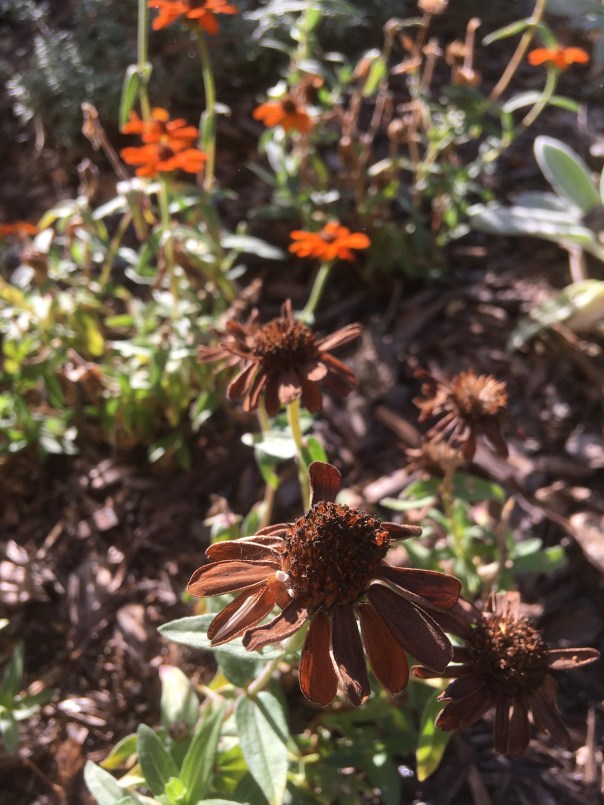 The two 4-inch zinnia starts I planted in June have grown gloriously bushy. It took me months to get around to deadheading them; this week was only the second time. A few flowers had formed seeds, which I scattered in hopes of finding some sprouts next spring. But they are likely hybrids, so who knows?